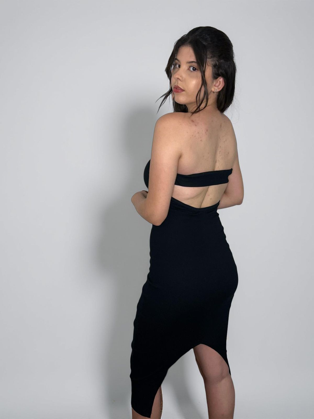 Vestido Midi tomara-que-caia costas abertas e fenda